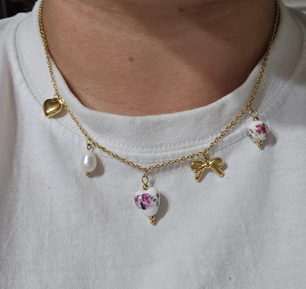 • Features 18k gold PVD plated stainless steel chain and charms, porcelain charms, and a freshwater pearl
