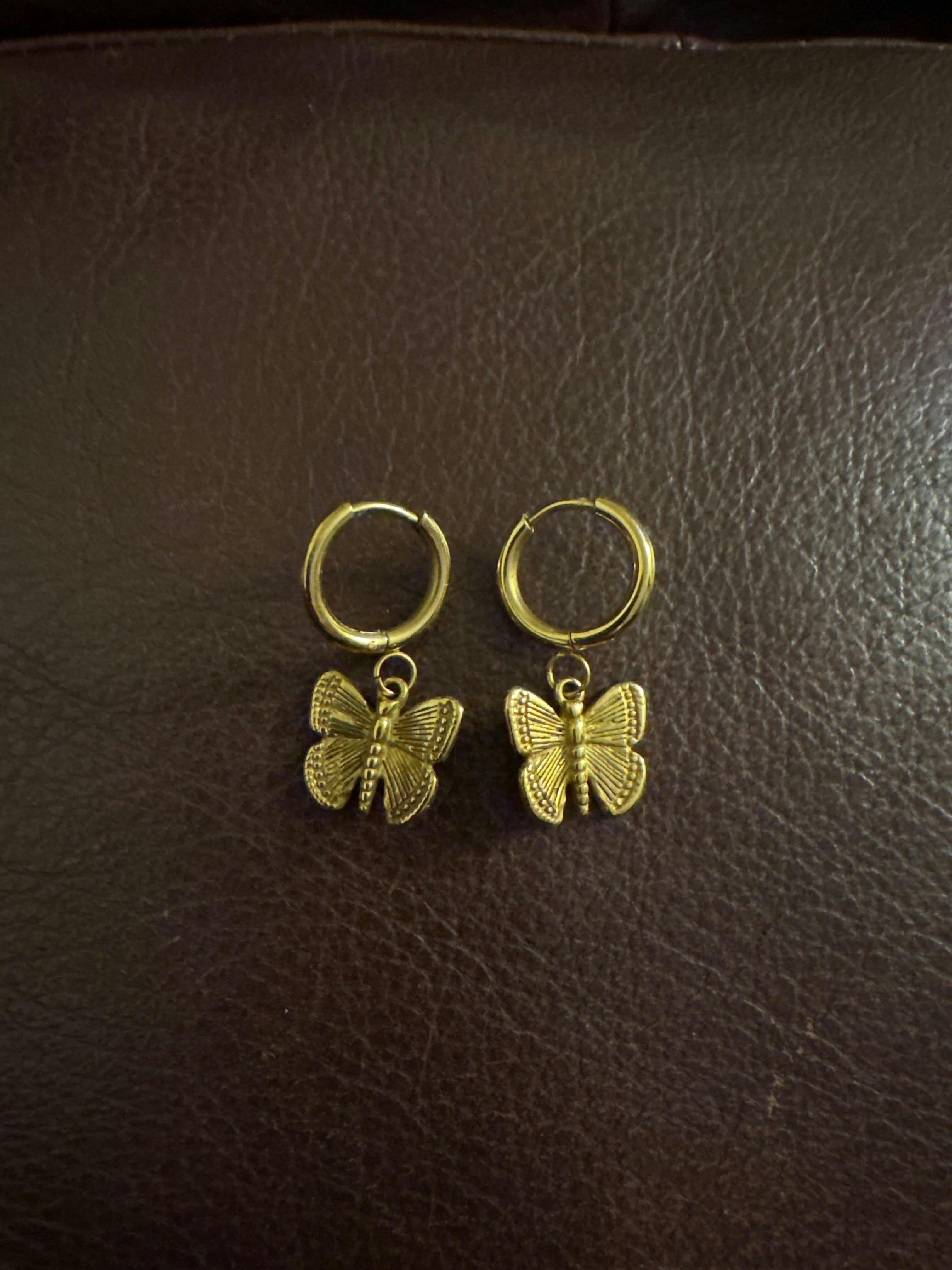 A pair of gold-colored huggie hoop earrings with butterfly charms attached, displayed against a white background.